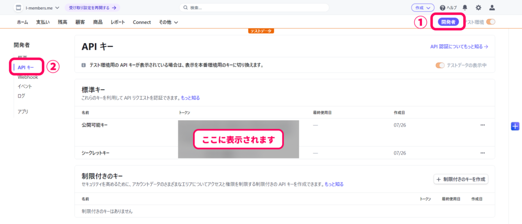 - 標準キーリストのシークレットキー行で、テストキーを表示をクリックします。