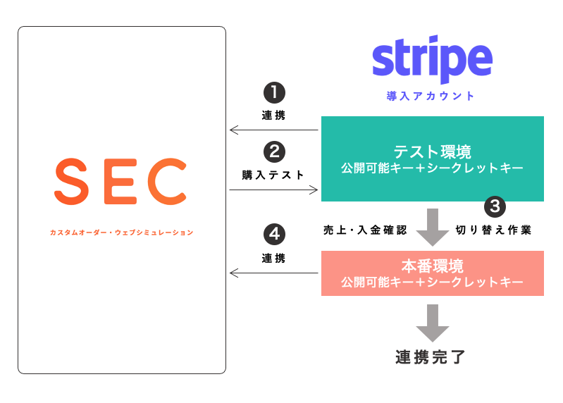 SECシステムとStripe決済を連携させる流れは、図1の①〜④となります。