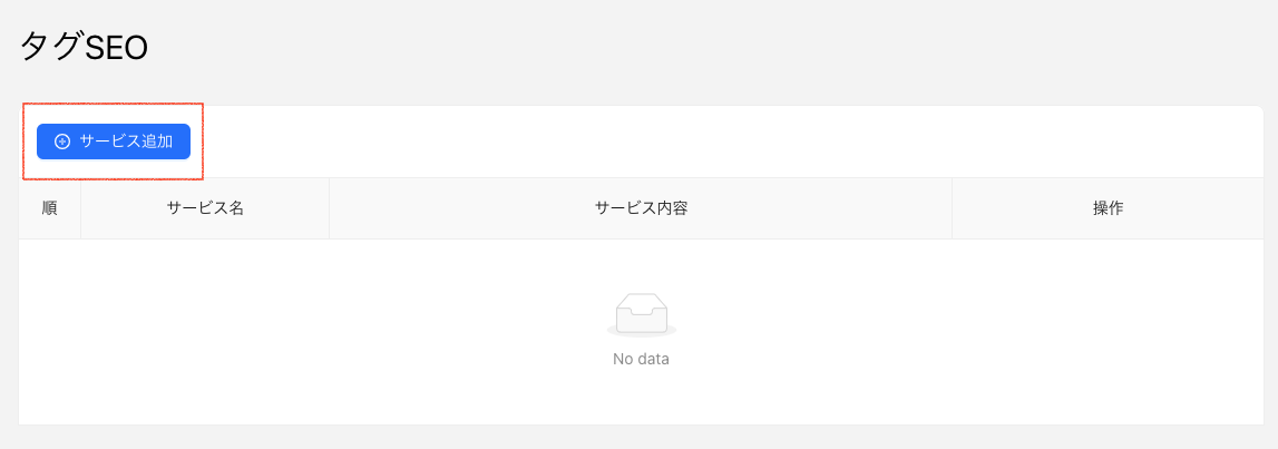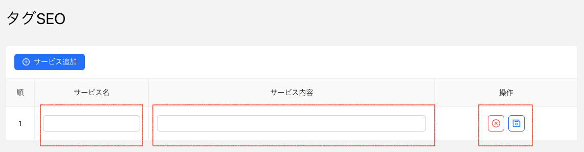 「2.タグSEO」をクリックしますと、画面右側に「順」と「サービス名」「サービス内容」「操作」が展開されます。赤枠で囲った「サービス追加」ボタンをクリックしてください。