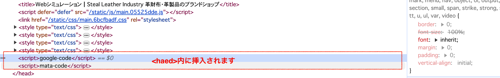 画面上を右クリック>検証(Chromeの場合、デベロッパーツールが便利です)またはソースの表示でソースコードを確認することができます。<haed>内に挿入されていることを確認してください。